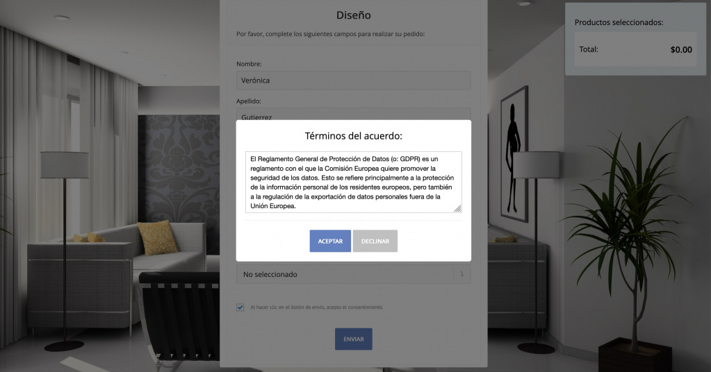 Para poder enviar el formulario web completado, el cliente deberá aceptar el consentimiento.