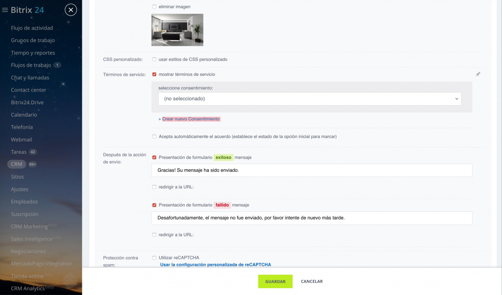 Vaya a la sección de CRM > Formularios del CRM, seleccione un formulario web > haga clic en Editar. En la sección de configuración del formulario web, haga clic en Más > desplácese hasta la sección Términos de servicio > habilite la opción Mostrar términos de servicio > haga clic en Crear nuevo consentimiento.