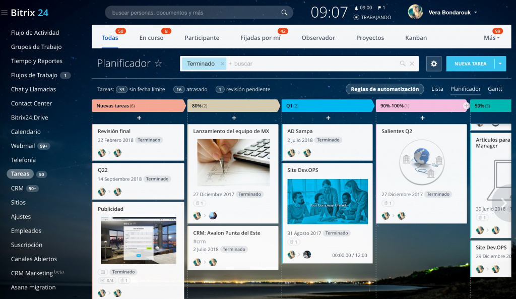 Puede establecer las reglas de automatización y su Bitrix24 creará automáticamente tareas vinculadas, pospondrá fechas límite, cambiará a los responsables, enviará correos electrónicos y más.