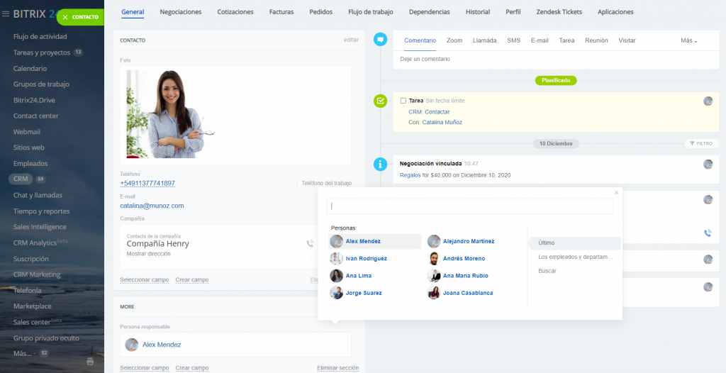 Bitrix24 tiene la opción de cambiar la persona responsable cuando se necesite. Por ejemplo, cuando tienen varios agentes de CRM responsables de diferentes etapas de artículos de CRM o procesos de ventas, o necesitan transferir a un cliente al departamento de soporte después de cerrar el trato.