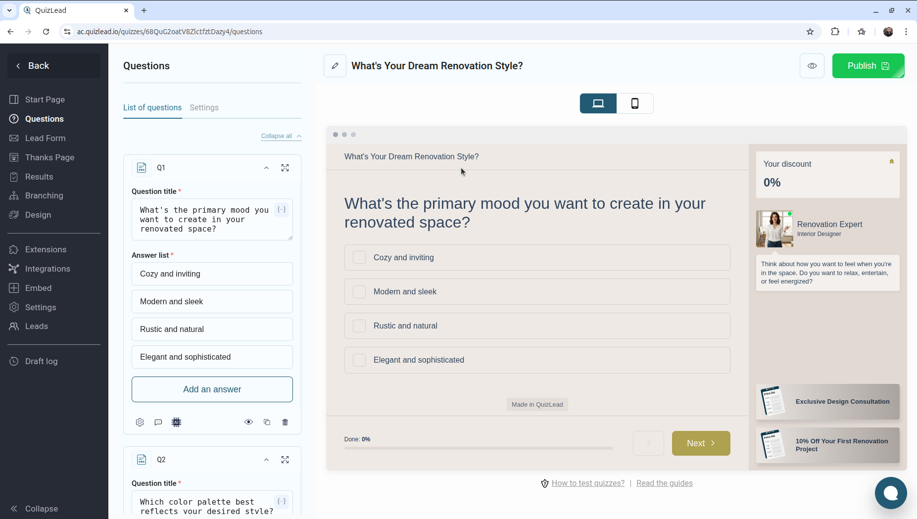 QuizLead está construido para la velocidad y la simplicidad. La interfaz fácil de usar te guía en cada paso, desde la creación del cuestionario hasta su difusión. Puedes insertar fácilmente los cuestionarios en tu sitio web, compartirlos a través de enlaces directos o utilizarlos en campañas de correo electrónico y redes sociales. La plataforma también proporciona análisis detallados para que puedas rastrear el rendimiento, ver cómo responden las personas y optimizar tus cuestionarios para obtener mejores resultados.