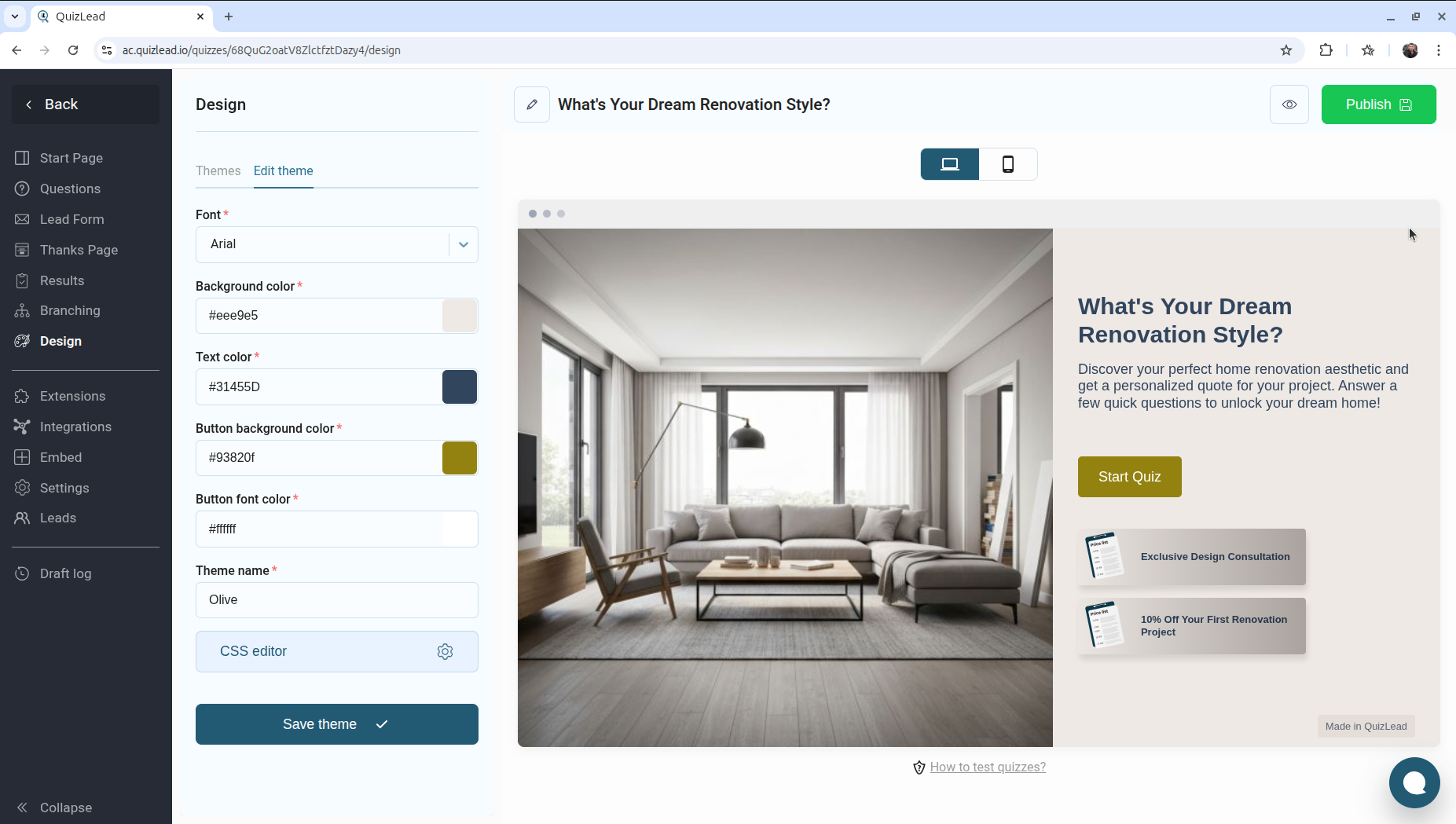 El branding (imagen de marca) es esencial para cualquier negocio, y QuizLead hace que sea sencillo alinear tu cuestionario con tu marca. Puedes personalizar completamente el diseño eligiendo tus colores, fuentes y temas. Añade tu logotipo y ajusta el diseño hasta que todo se sienta perfecto. Para aquellos que quieren llevar la imagen de marca aún más lejos, QuizLead permite alojar los cuestionarios en tu propio dominio o en un subdominio de tu elección. Esto mantiene tu marca en primer plano, dando a tus cuestionarios un aspecto verdaderamente profesional y convirtiéndolos en una parte integral de tu sitio web o embudo de marketing.