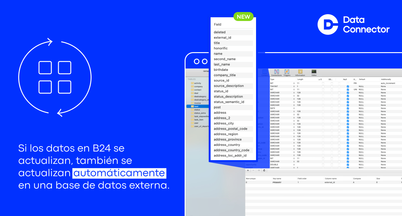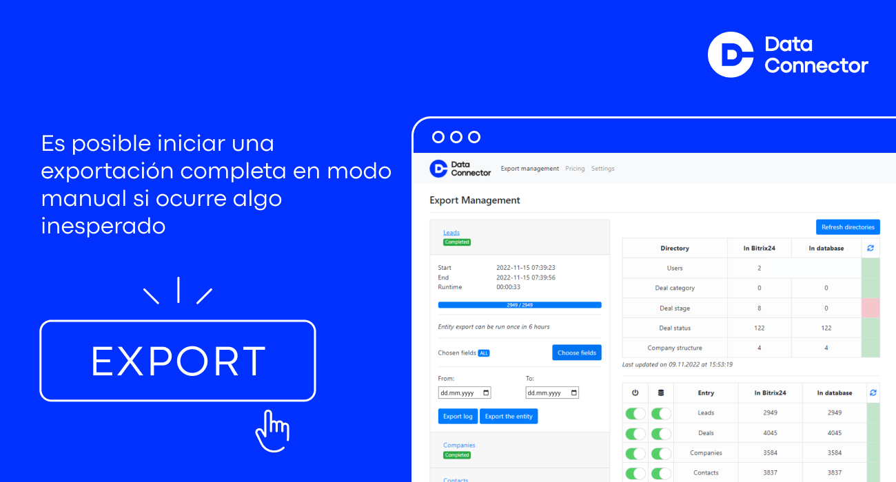 Inicialmente, la aplicación debe instalarse en la cuenta de Bitrix24 y conectarse a una base de datos externa (MySQL). Después de eso, Data Connector comienza a exportar todas las entidades seleccionadas y los campos requeridos a la nube, actualizándolos en tiempo real o diariamente en el horario establecido. El usuario, que tiene acceso completo a la base de datos analítica, se conecta a ella y trabaja con los datos de forma independiente. Nuestro servicio resuelve la tarea más importante: exportar datos del sistema CRM.