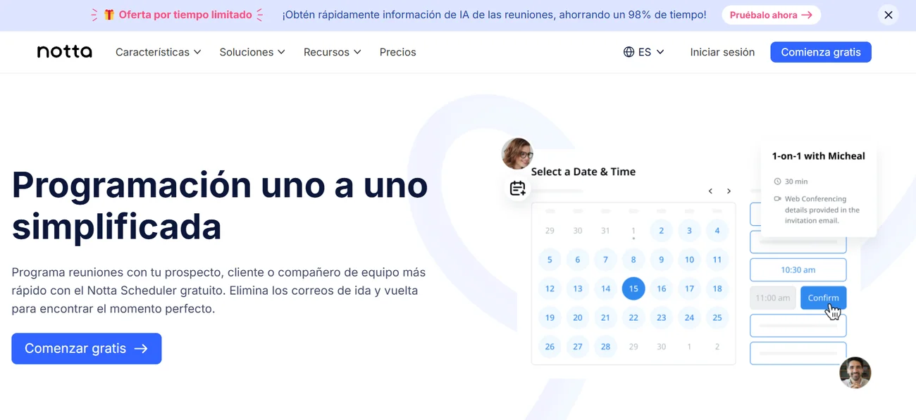 Notta es una herramienta de IA para tomar notas en reuniones, que también podrás emplear para transcribir entrevistas y grabaciones. Lo más destacable de esta app frente a otras alternativas a Otter.ai es que transcribe y traduce al instante más de 10 idiomas, permitiendo mayor fluidez durante reuniones multilingües. Si tienes un equipo internacional o clientes a lo largo del mundo, esta puede ser la plataforma perfecta para ti.