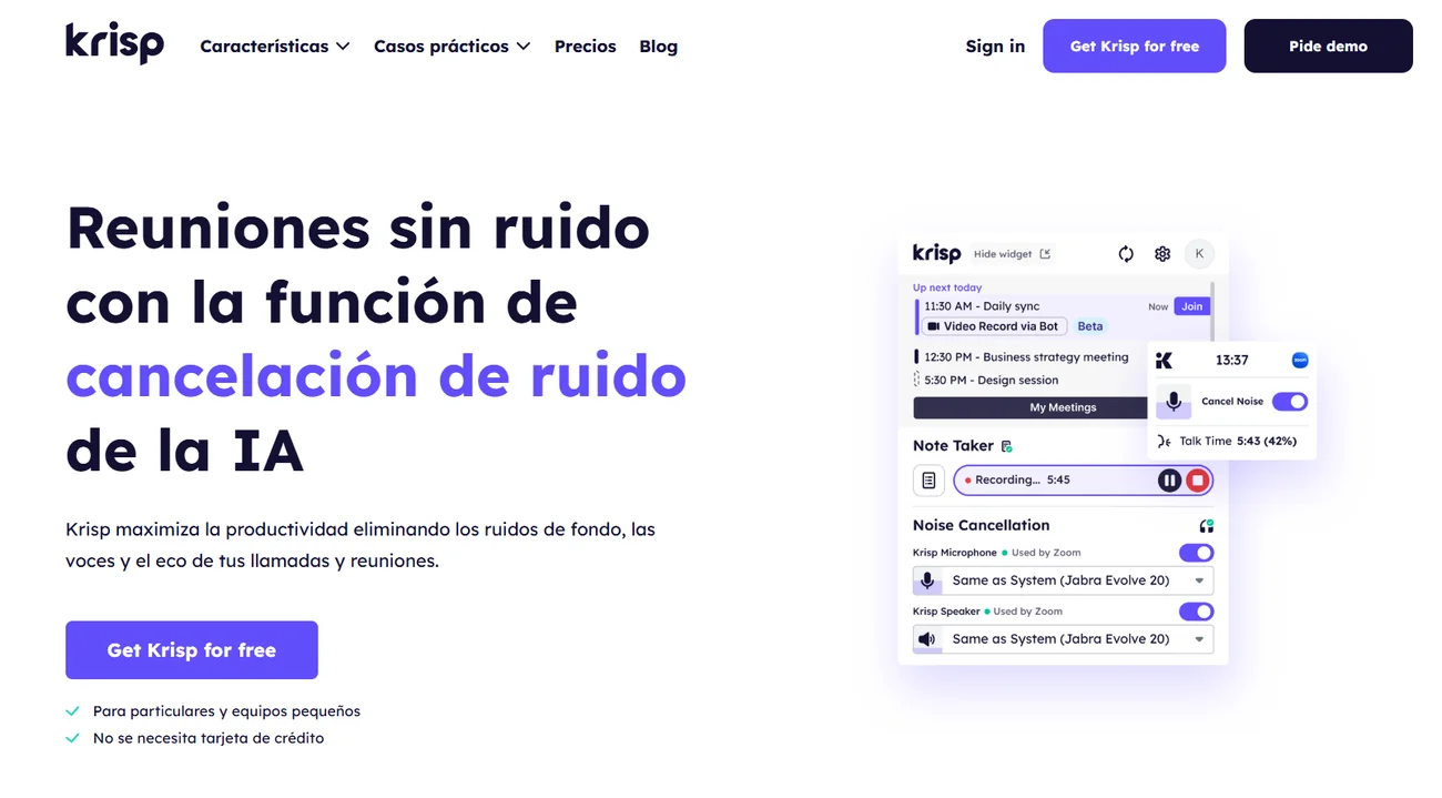 La plataforma para escritorio Krisp es, indudablemente, una de las alternativas a Otter.ai que más ha captado la atención del mercado en los últimos tiempos, debido a su gran variedad de funciones. Emplea la cancelación de ruido con IA para eliminar ecos y voces de fondo tanto en el audio entrante como saliente en cualquier herramienta de videoconferencia, garantizando transcripciones más limpias.