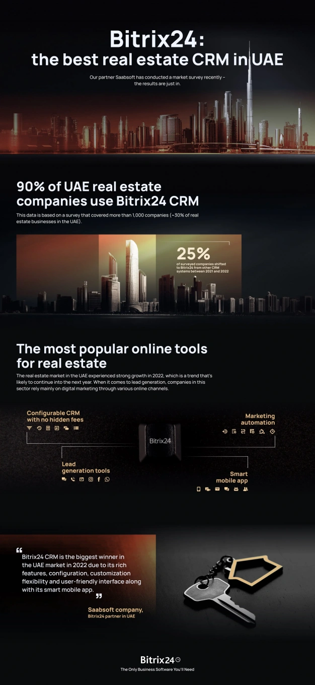 La encuesta (realizada del 31 de agosto de 2022 al 15 de octubre de 2022) cubrió más de 1.000 empresas de bienes raíces (~30 % de negocios inmobiliarios en los Emiratos Árabes Unidos). Más del 90% de las empresas inmobiliarias utilizan Bitrix24 CRM. El 25% de las empresas encuestadas cambiaron a Bitrix24 de otros sistemas de CRM entre 2021 y 2022.
