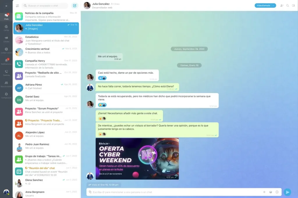 No dejes que la distancia se convierta en un problema o la dispersión de datos afecte la coordinación del día a día. Para poner en marcha las mejores prácticas de colaboración en las pequeñas empresas, puedes utilizar soluciones en la nube para compartir y coeditar documentos, gestionar proyectos y mantener una comunicación fluida en tiempo real. Plataformas como Bitrix24 integran en un único lugar la gestión de tareas y proyectos, el almacenamiento de archivos y la comunicación en equipo. Por ejemplo, en vez de depender de correos electrónicos, tu pequeña empresa podría utilizar un chat interno, videollamadas y comentarios en tareas para lograr una comunicación más fluida, reduciendo así los malentendidos