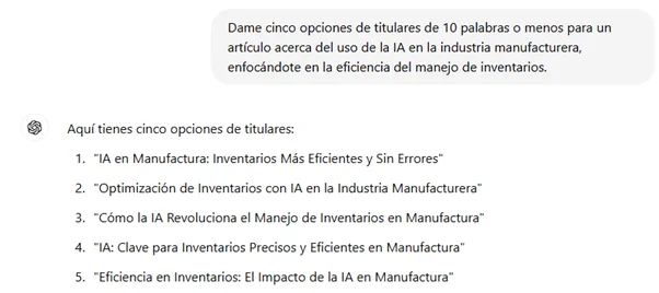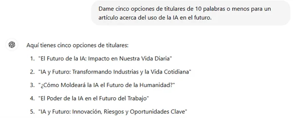 Por ejemplo, supón que necesitas ayuda para crear titulares optimizados. En lugar de pedir simplemente “ideas de titulares,” puedes ser más específico: solicita cinco opciones de titulares de 10 palabras o menos para un artículo acerca del uso de la IA en el futuro.