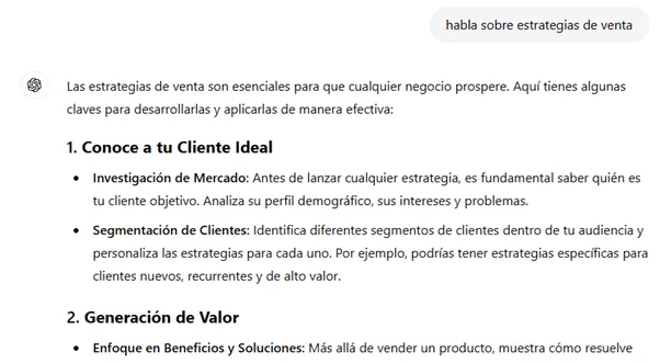 Imagina que necesitas consejos para aumentar las ventas online de tu pequeña empresa. Veamos qué pasa si le pides a ChatGPT[2] “hablar sobre estrategias de venta”:
