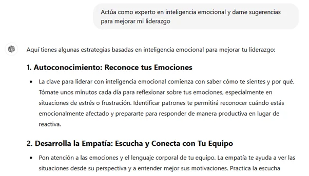 En cambio, si le indicas que asuma el rol de un “experto en inteligencia emocional” le das a la IA una identidad desde la cual responder, orientándola a ofrecer ideas más detalladas y con un enfoque especializado.