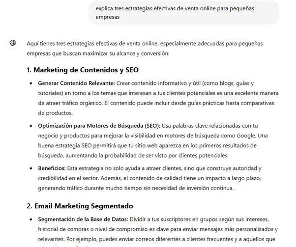 El resultado es demasiado vago como para ser accionable. En cambio, si le dices, “explica tres estrategias efectivas de venta online para pequeñas empresas,” estás orientando mucho mejor la respuesta, dirigiéndola hacia los resultados específicos que necesitas.