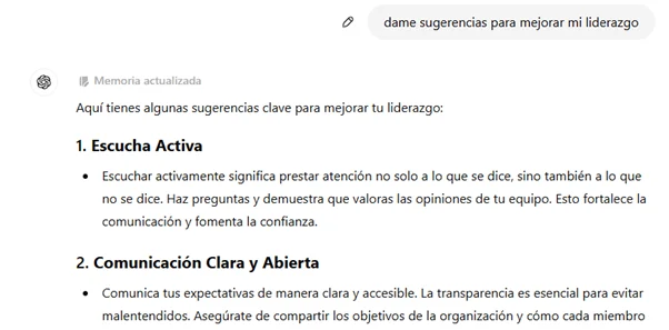 Por ejemplo, si necesitas consejos sobre liderazgo, un prompt genérico como “dame sugerencias para mejorar mi liderazgo” podría producir una respuesta útil pero superficial.