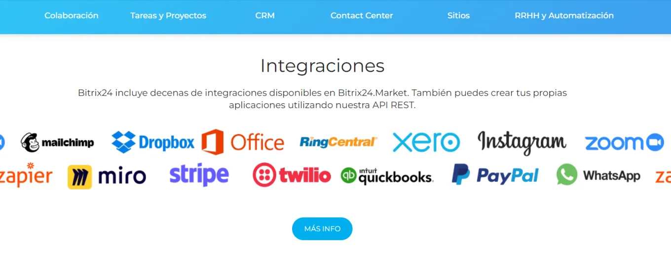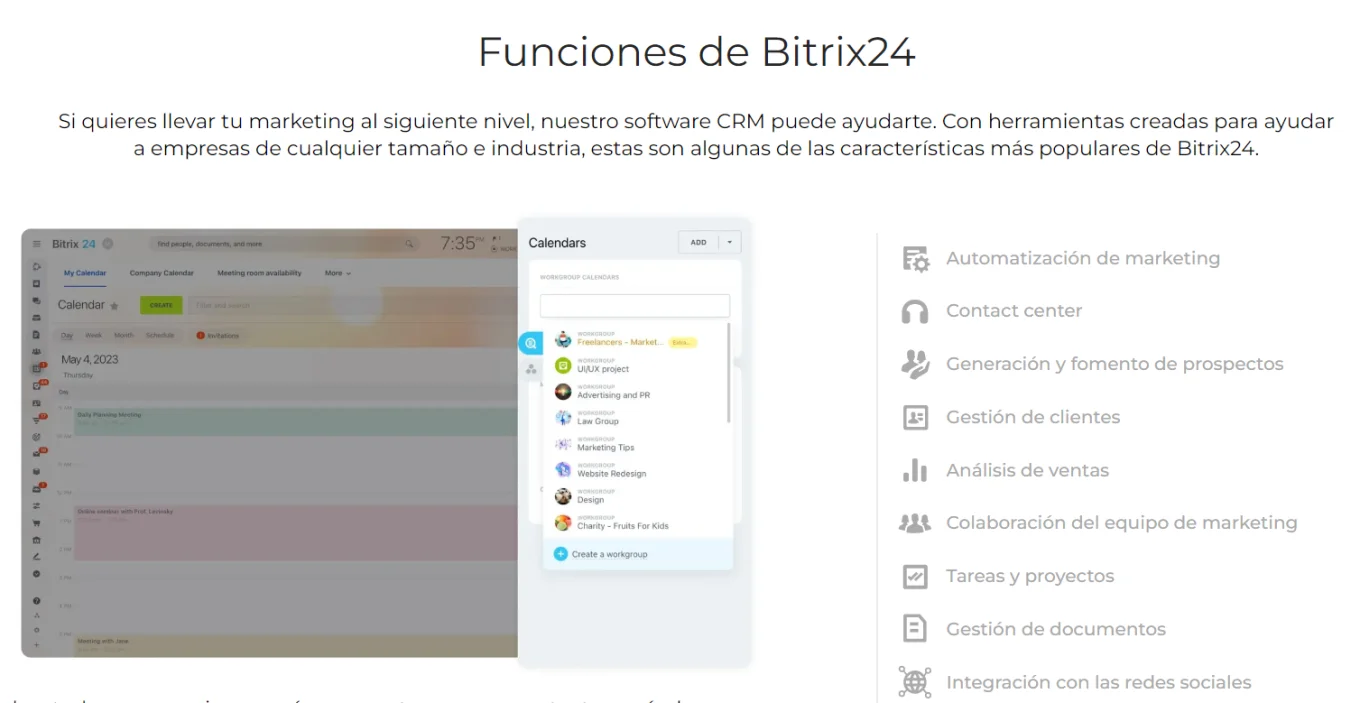 Un servicio como Bitrix24 te ofrece otras posibilidades: la integración con aplicaciones de e-commerce, redes sociales y todo lo que tu equipo necesita para colaborar y comunicarse de manera eficiente, como chat, videollamadas y conferencias, almacenamiento de archivos, calendario, documentos online, seguimiento del tiempo de trabajo y más. Aprovecha al máximo todas las integraciones que te ofrecemos en nuestro sistema de CRM.