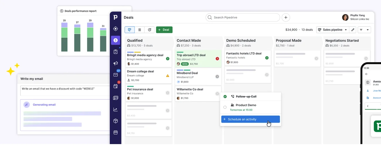 Pipedrive destaca por su enfoque en la simplicidad y la eficiencia en ventas. Diseñado por expertos en ventas para equipos de ventas, es una plataforma intuitiva que te permite gestionar todo el proceso de hacer negocios sin complicaciones innecesarias. ¿Tu prioridad es cerrar más ventas y hacerlo de manera más rápida? Entonces, Pipedrive es una excelente opción.