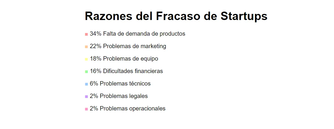 Las estadísticas son claras: el 34% de las startups fallan por falta de demanda de sus productos, un 22% debido a problemas de marketing, un 18% por problemas de equipo y un 16% por dificultades financieras. Además, problemas técnicos, legales y operacionales contribuyen al fracaso en un 6%, 2% y 2% respectivamente. Estos datos subrayan la necesidad de contar con herramientas específicas para cada uno de estos desafíos.