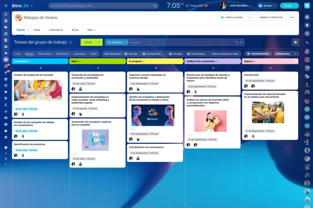 En herramientas como Bitrix24, los tableros visuales se convierten en un componente central para la gestión de proyectos. Sus funcionalidades incluyen tableros Kanban, diagramas de Gantt y checklists personalizables que simplifican la planificación y el seguimiento de proyectos. Además, integran la colaboración en tiempo real con calendarios compartidos, videoconferencias y bases de conocimiento, haciendo que el flujo de trabajo sea más dinámico y efectivo.