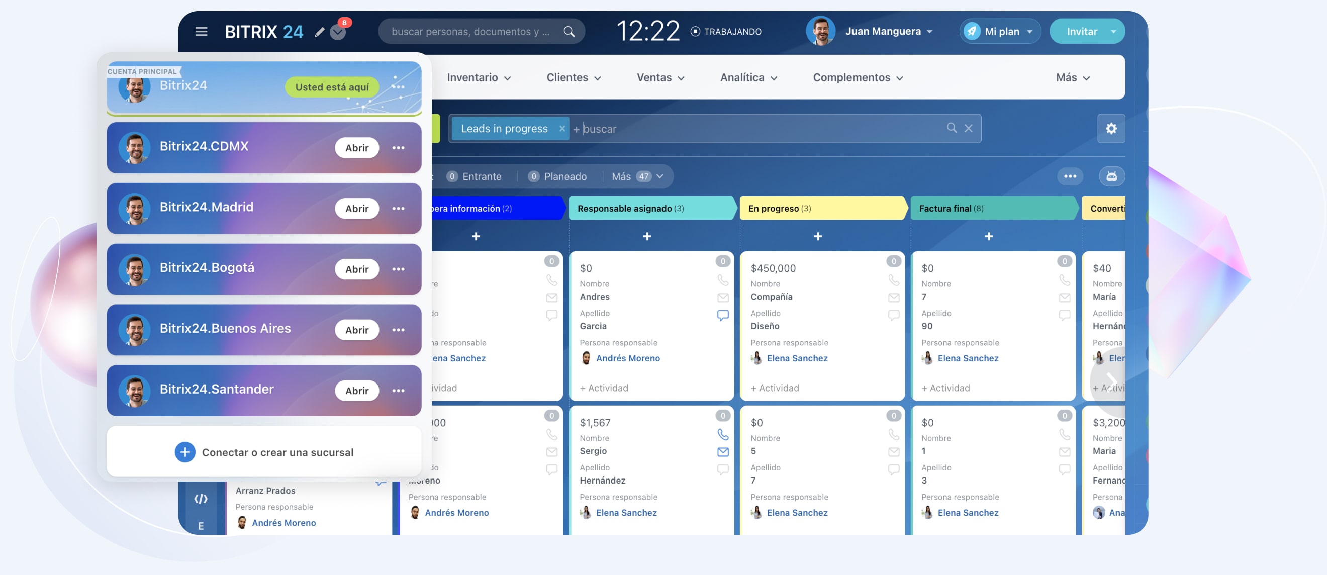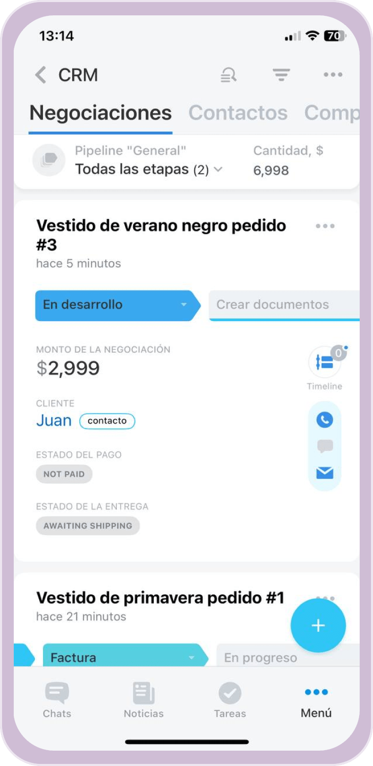 tu oficina está donde tú estés. Bitrix24 te permite encontrar rápidamente información sobre un cliente/una negociación existente o agregar uno nuevo. Mantente en contacto con tu equipo, planifica tu día y acepta pagos, todo con nuestro CRM móvil.