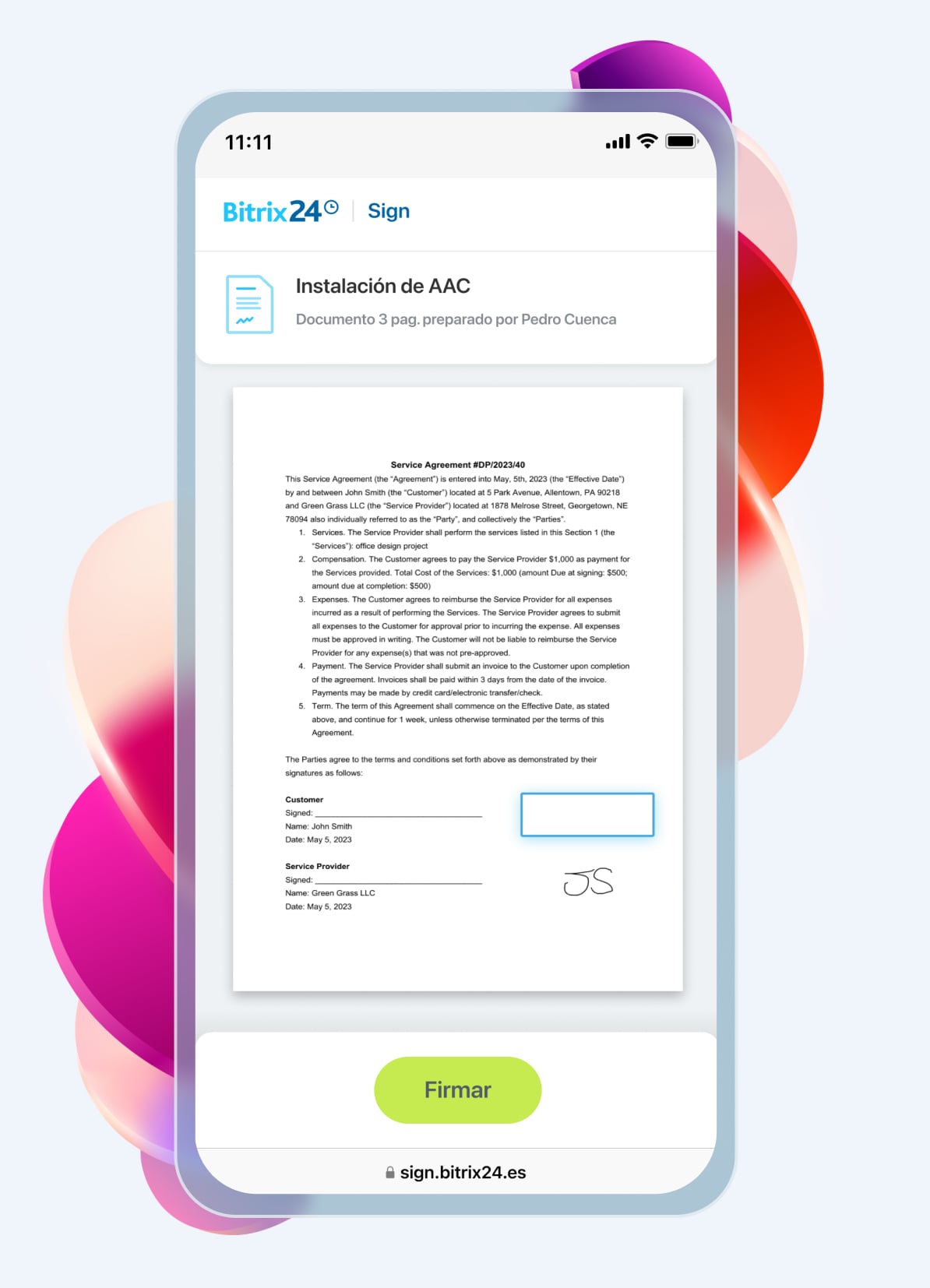 La nueva herramienta de firma electrónica de Bitrix24 te permite firmar cualquier documento online, directamente desde tu CRM, de forma rápida y sencilla. Es ese pequeño empujón final que necesitan tus agentes para sellar la negociación y hacer que la venta suceda.