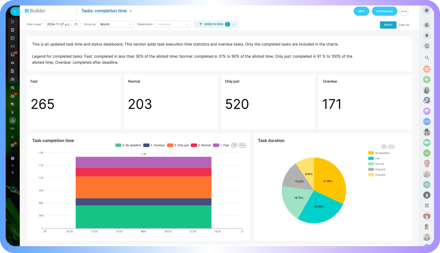 Nuevos paneles están disponibles ahora en BI Builder: crea informes sobre la eficiencia de los empleados y su participación en tareas. Además, ahora puedes cargar tus propios datos en formato CSV en BI Builder.