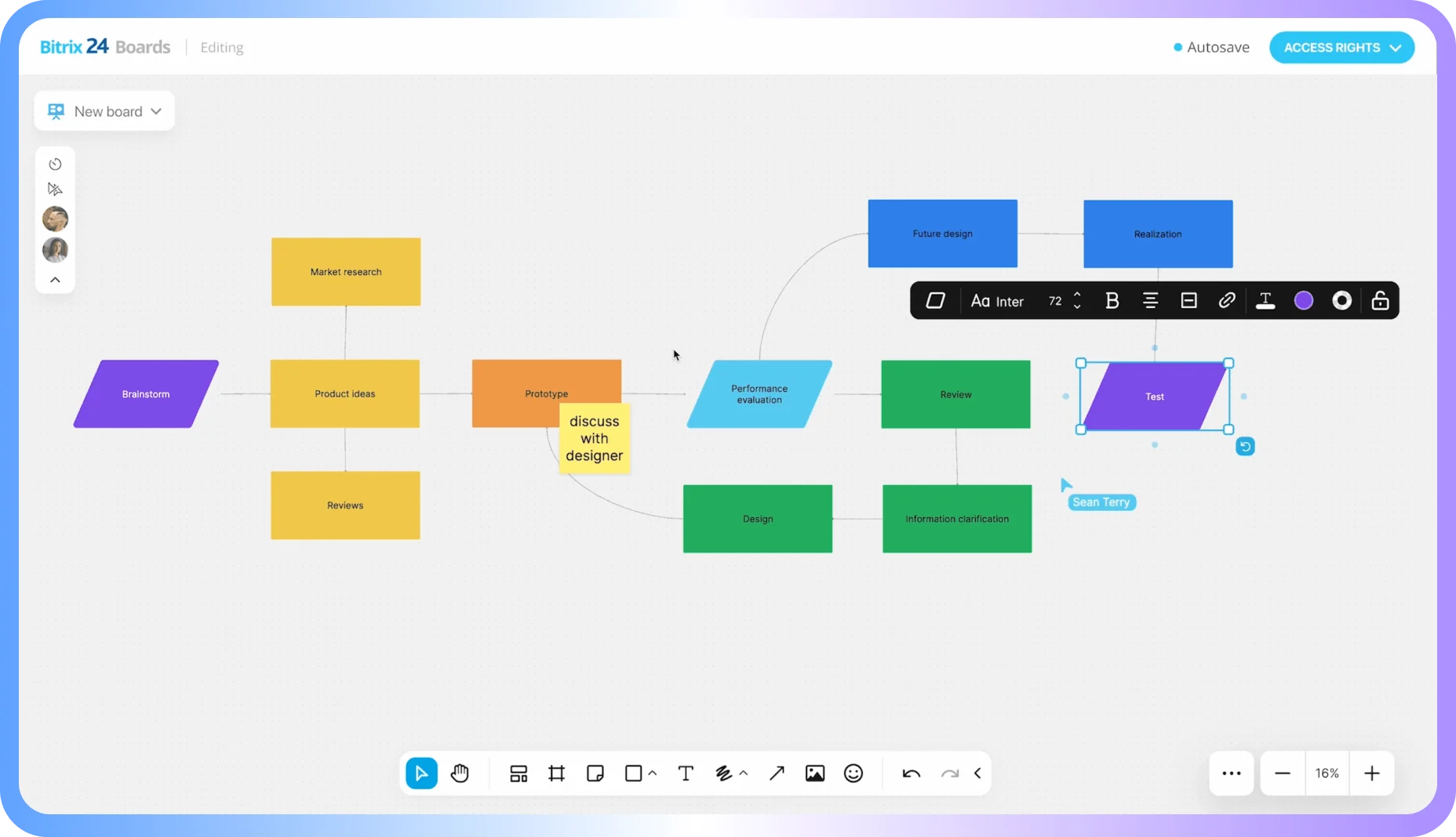 Desde sesiones de estrategia y sprints de diseño hasta la visualización de flujos de trabajo y la planificación de proyectos, los Tableros de Bitrix24 ayudan a tu equipo a mantenerse organizado, creativo y conectado.