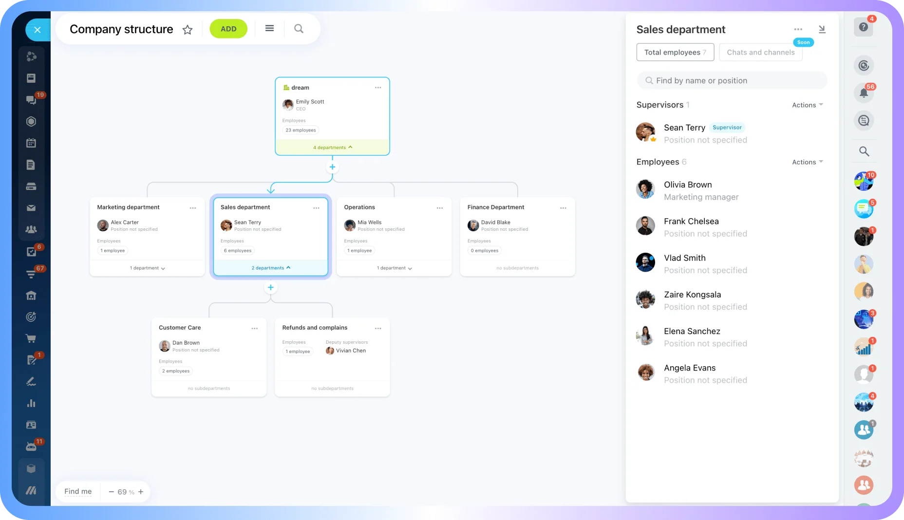 Los empleados se eliminan automáticamente de los chats y canales del departamento anterior cuando cambian de puesto y se añaden a los nuevos.