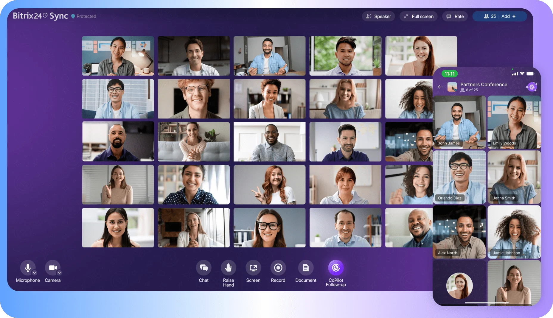 Con el rendimiento mejorado, nuestro Bitrix24 Sync te permite tener hasta 1,000 participantes en una sola llamada mientras mantienes una alta calidad de imagen, especialmente durante el uso compartido de pantalla.