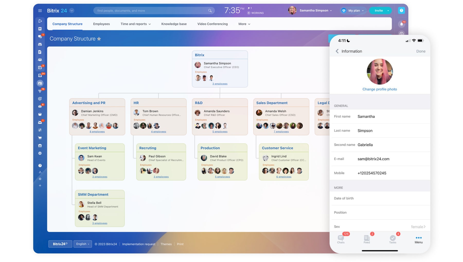 Cuanto más rápido crece tu negocio, más rápido te das cuenta de que comenzar un negocio es fácil, y que lo difícil es mantenerlo. A medida que tu empresa comience a tomar el control, adquieras nuevos clientes y contrates nuevo personal, de repente necesitarás una estructura operacional escalable y un conjunto de herramientas adecuadas para mantenerla. Afortunadamente, Bitrix24 puede ayudarte tanto a construir la infraestructura interna como las relaciones externas. Administra personas, proyectos, clientes y marketing, todo desde una sola plataforma.