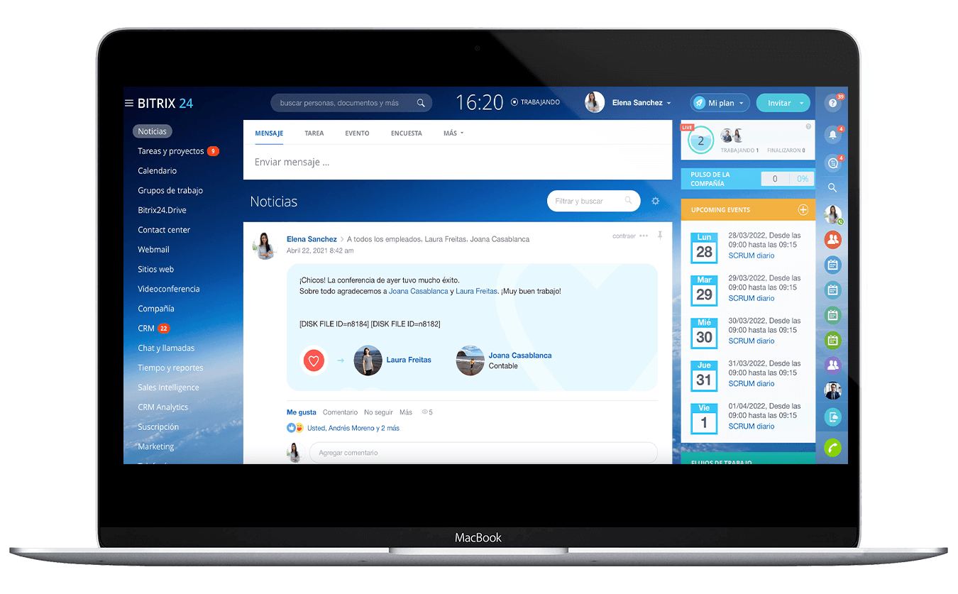 Bitrix24 es un espacio de trabajo online diseñado para ser utilizado por un grupo de personas para ventas, marketing, gestión de proyectos y otras actividades. Cuenta con CRM, tareas, chats, reuniones online y más de 30 herramientas.