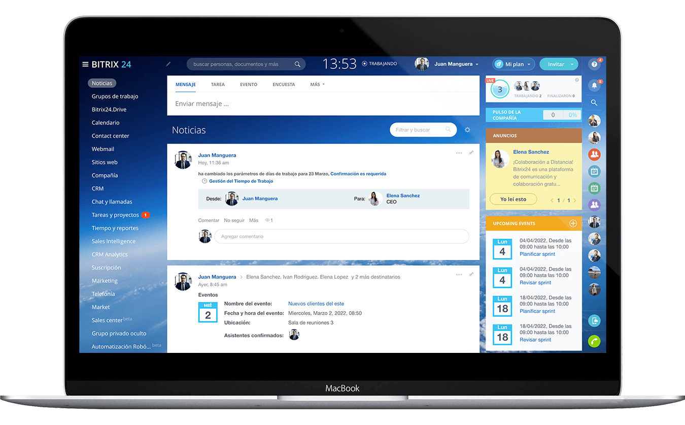Una tarea complicada para los departamentos de recursos humanos es construir y fomentar la cultura de la empresa. El software para la administración de oficinas de Bitrix24 proporciona herramientas para impulsar la participación y las redes sociales de la empresa.