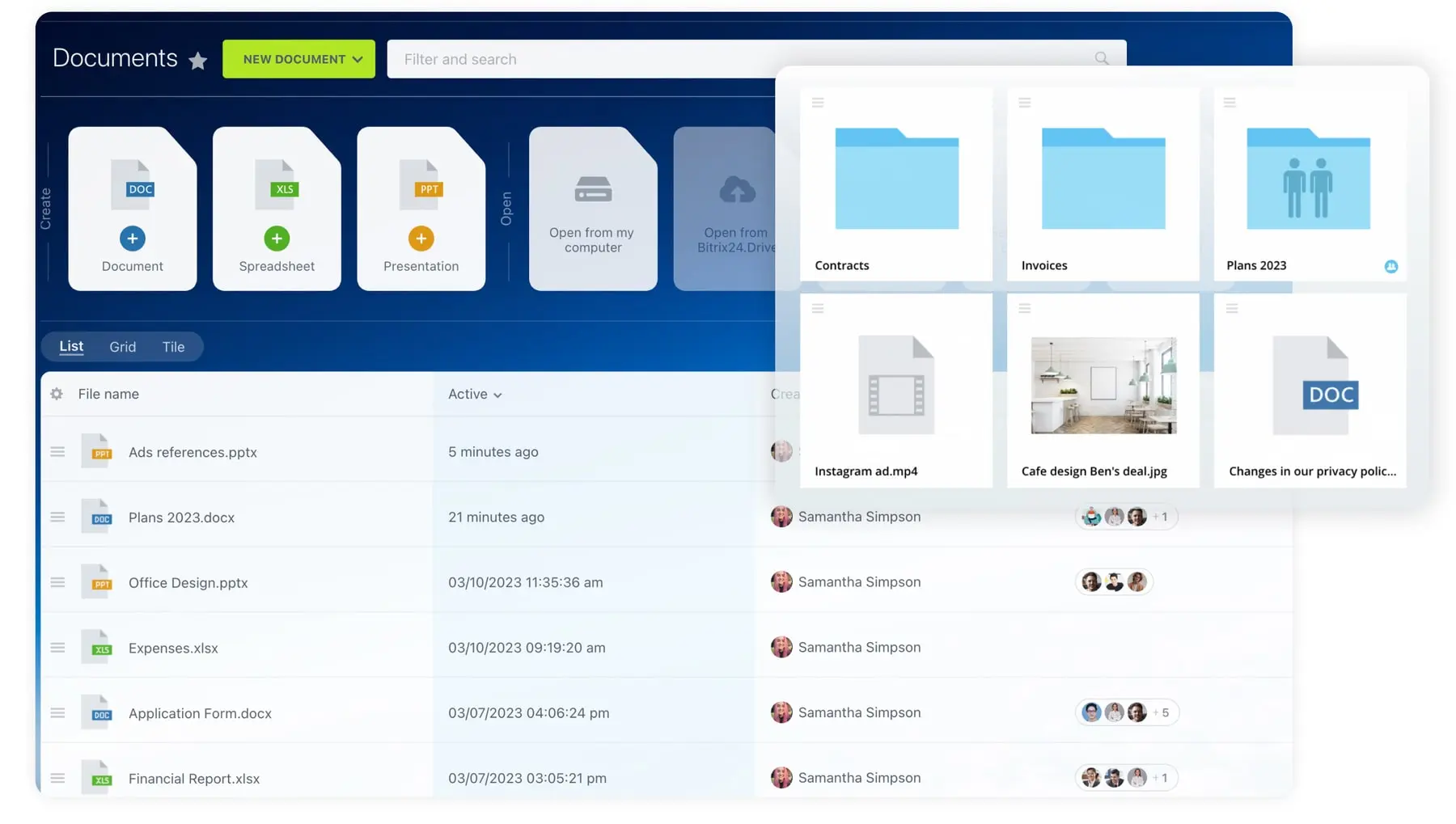 Mantén todos los archivos de tu empresa reunidos en un espacio de almacenamiento único y protegido en la nube, y accede a ellos desde cualquier lugar con la aplicación móvil de Bitrix24. Con permisos de acceso personalizables, tu empresa podrá mantener todos los archivos seguros y protegidos. Las empresas también pueden proporcionar acceso limitado a los clientes para compartir archivos específicos, creando menos desorden en la bandeja de entrada y agilizando algunos procesos. Otro beneficio de compartir y almacenar archivos es que se pueden reducir los costos de papel y el espacio de almacenamiento. Los archivos de los documentos digitales almacenados son fáciles de buscar, etiquetar y organizar.