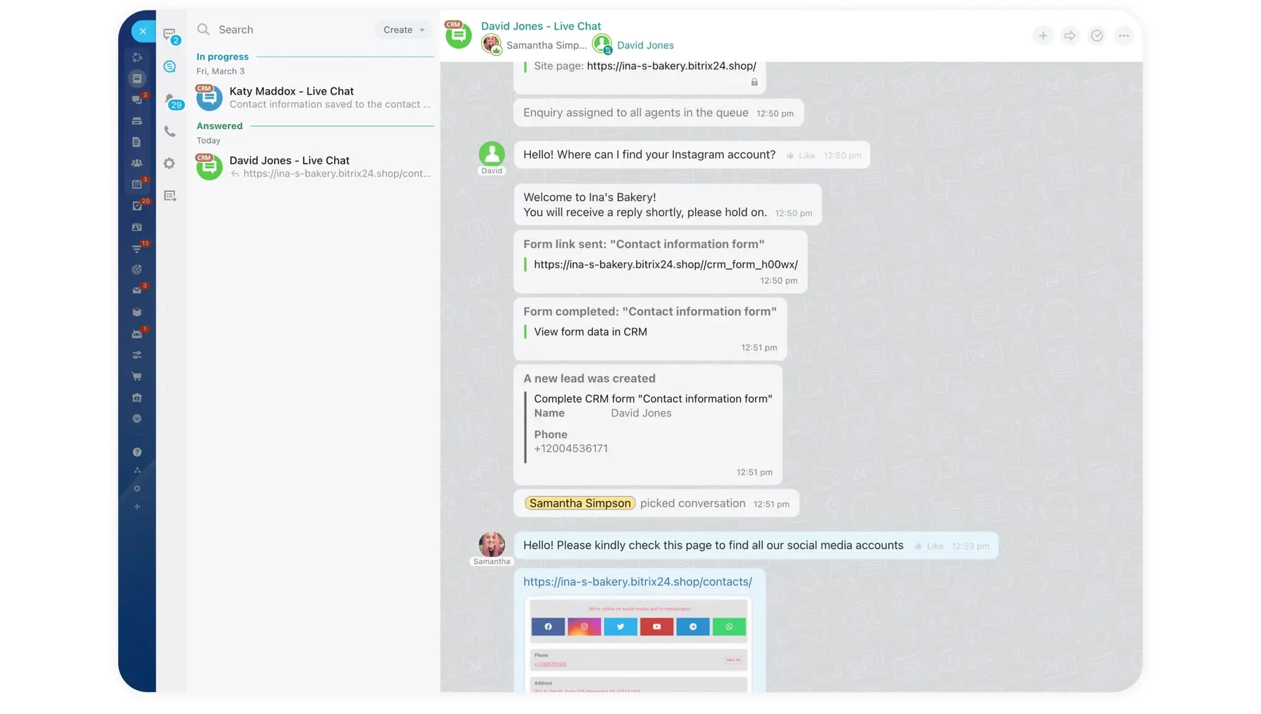 No importa cuál sea el tamaño de tu empresa, los clientes utilizarán las plataformas sociales para ponerse en contacto contigo. Mantener los perfiles en las redes sociales también da a las empresas la oportunidad de mostrar al mundo el nombre de sus marcas. Puedes conectar a Bitrix24 todas tus cuentas de las redes sociales y mensajeros, y administrarlos mediante un panel de control único.