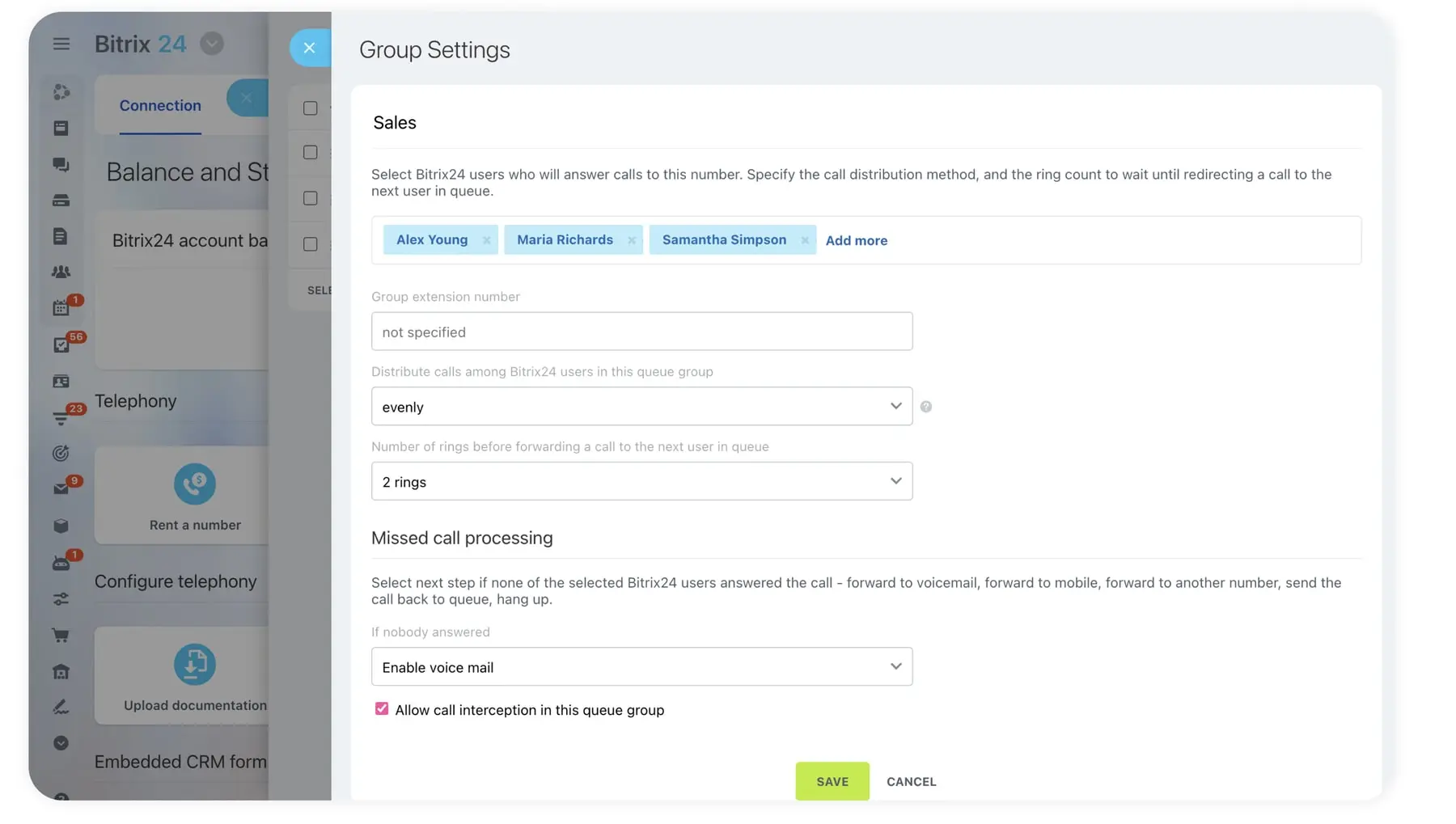 Llama a cualquier parte del mundo al mismo costo que las llamadas nacionales con el servicio de Telefonía. Para las empresas que operan a nivel internacional, este beneficio es invaluable y es parte de Bitrix24. El servicio de Telefonía ayuda a las empresas con ubicaciones internacionales y a los clientes a mantenerse en contacto más fácilmente, lo cual es un punto esencial para proporcionar un excelente servicio al cliente. No importa de dónde llamen tus clientes, podrás comunicarte con ellos más fácilmente y a menor costo.