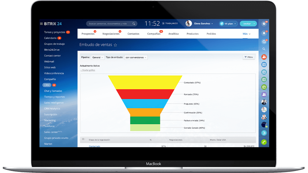 El software CRM de Bitrix24 proporcionará a tu empresa las herramientas necesarias para atraer prospectos y hacer un seguimiento del proceso mediante el canal de ventas. Los equipos de ventas pueden utilizar la información para saber que tácticas de marketing están funcionando y las que no.
