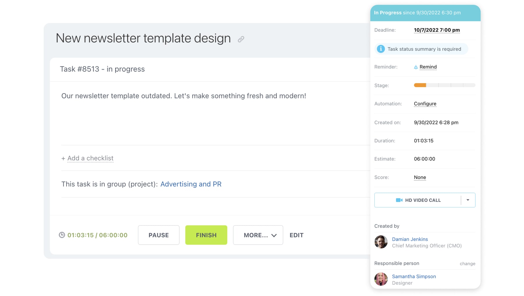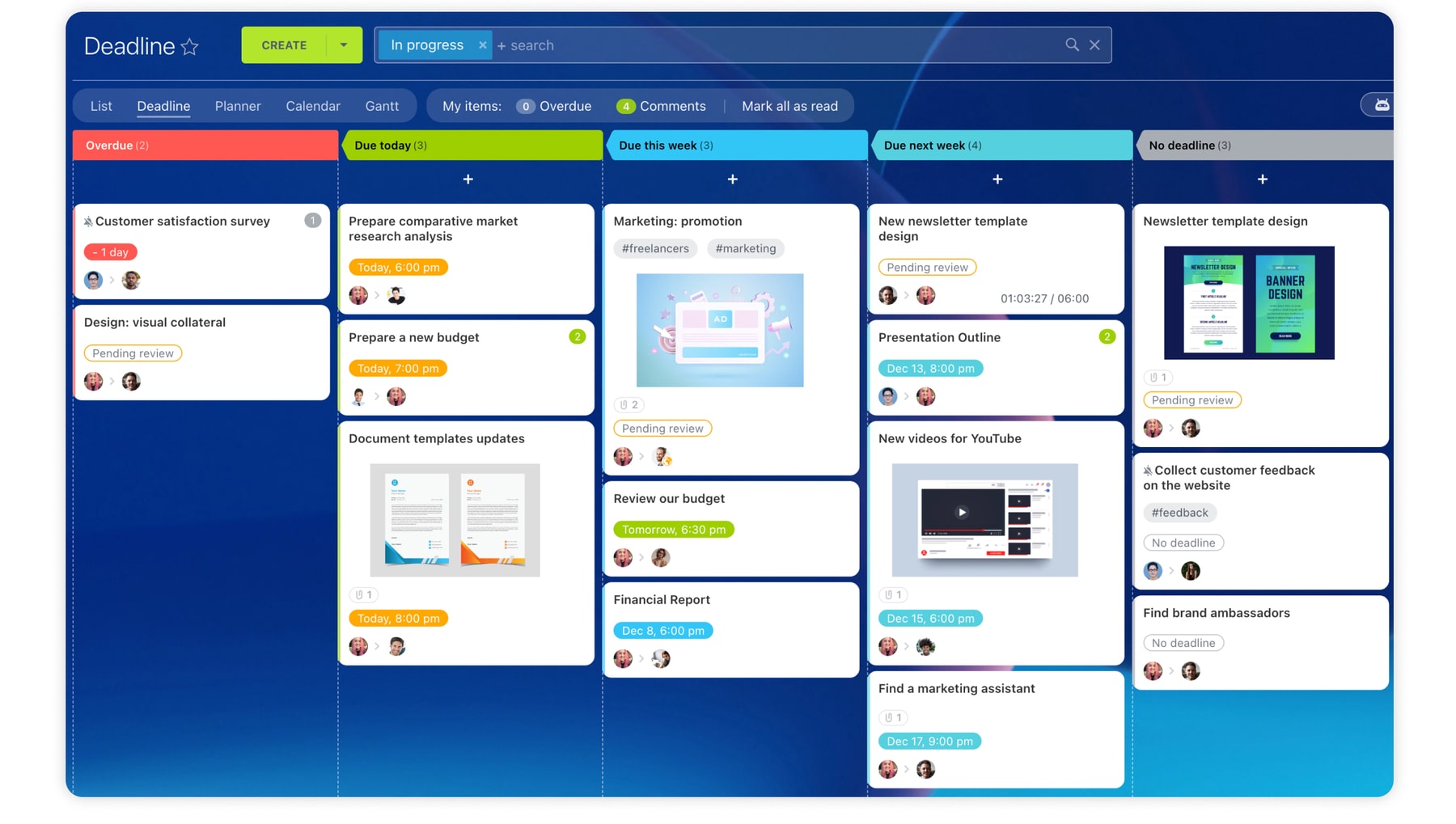 Para quienes asignan tareas, la herramienta para la administración de proyectos facilita el trabajo. En el caso de las tareas recurrentes, usa la configuración automatizada para establecer tareas diarias, semanales, mensuales o personalizadas. Comunícate en las tareas para llevar un registro del progreso o utiliza la función de chat para discutir las cargas de trabajo. Los jefes del proyecto pueden ver la carga de trabajo de los miembros del equipo, y asignar o quitar tareas según sea necesario.