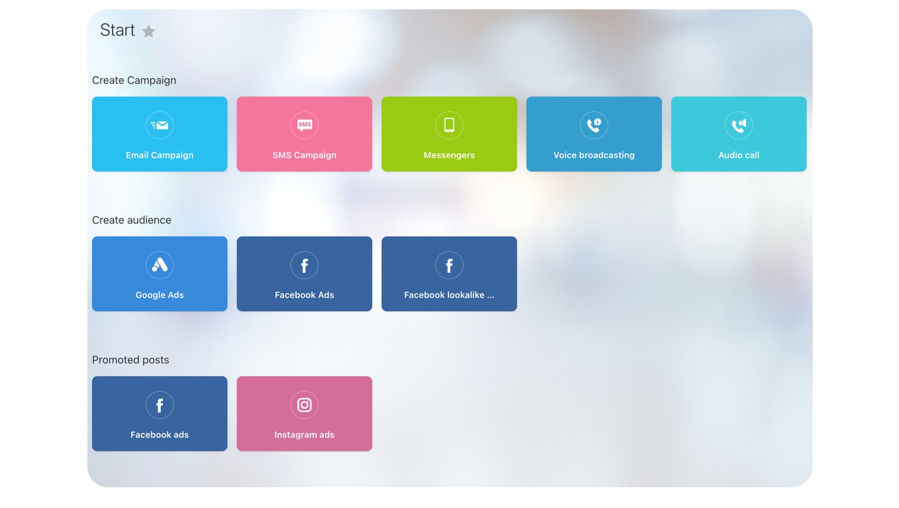 Crea y lanza campañas de marketing directamente desde tu CRM. Elige entre varios canales promocionales para elegir los que llegarán a tu público objetivo: marketing por correo electrónico, difusión de voz, SMS, Google Ads, Facebook Ads, mensajería y mucho más.