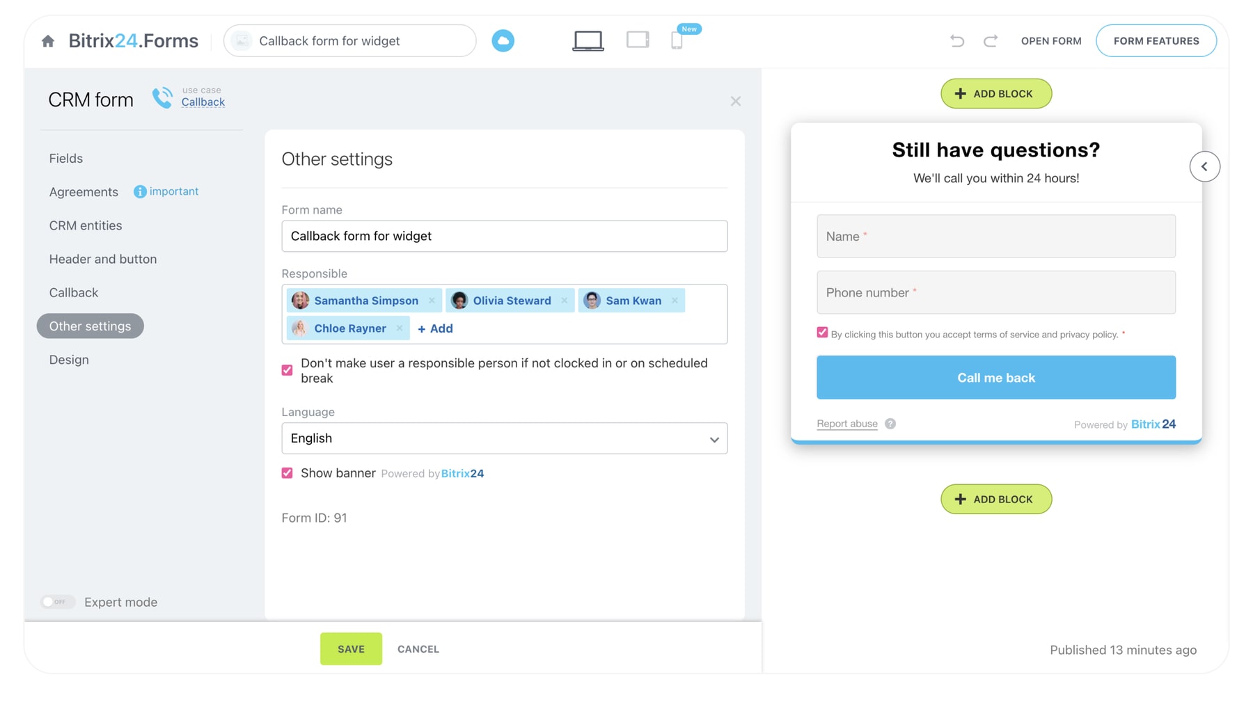 Otra característica común en los sitios web es una vía para ponerse en contacto con el servicio de atención al cliente de la empresa. El chat en vivo es una excelente función para ello, pero otras personas buscan información sobre a quién llamar para pedir ayuda. Bitrix24 proporciona herramientas a las empresas para que configuren su propio centro de atención al cliente. Este cuenta con representantes de la empresa o incluso un solo propietario, en el caso de las pequeñas empresas. Si necesitas ayuda con los centros de atención al cliente automatizados, puedes usar los bots de Bitrix24 y la IA para obtener ayuda adicional. Esto es especialmente valioso para las pequeñas empresas que tienen menos empleados.