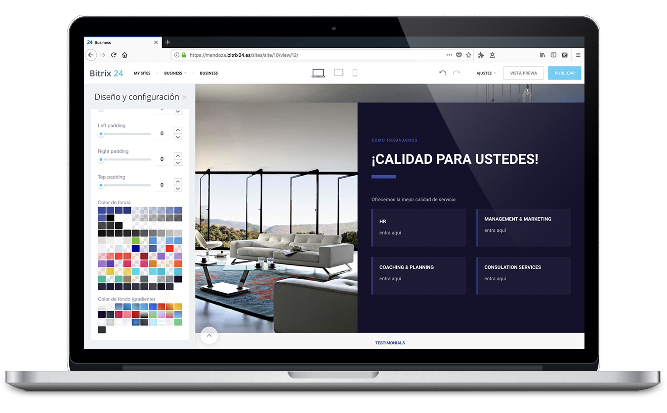 No hay dos empresas exactamente iguales, entonces, ¿por qué dos sitios web deberían ser idénticos? Utiliza el creador de sitios web de Bitrix24 para crear un diseño que se adapte a la personalidad y cultura de tu empresa. Obtén acceso a diseños limpios y profesionales, y después personalízalos para que se ajusten a tus necesidades. Hay muchos elementos de diseño divertidos y opciones de diseño disponibles para que el sitio de tu empresa se adapte a tu personalidad.