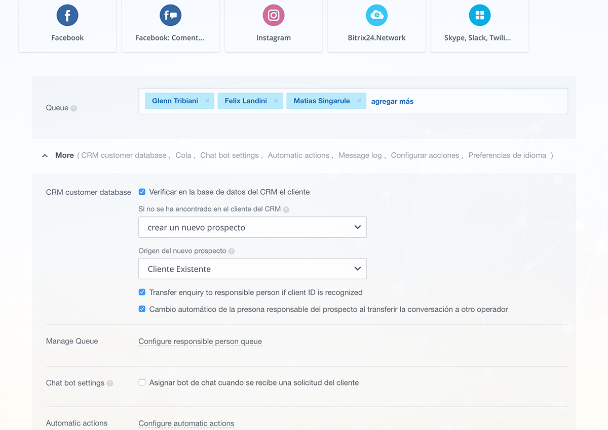 Nuestro chat en vivo puede mejorar con algunas capacidades de IA al instalar soluciones de chatbot de terceros desde Bitrix24 Market, para proporcionar ayuda omnicanal de calidad a tus clientes.