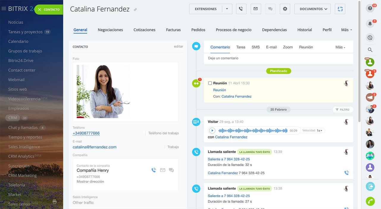 La telefonía de Bitrix24 cuenta con seguimiento de llamadas, enrutamiento, reenvío, transcripción, grabación y mucho más.