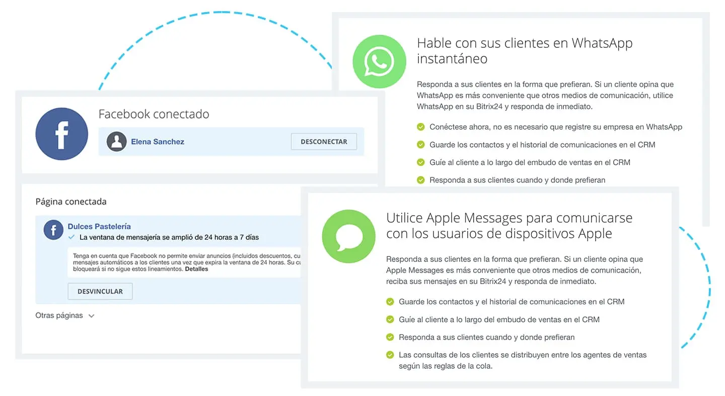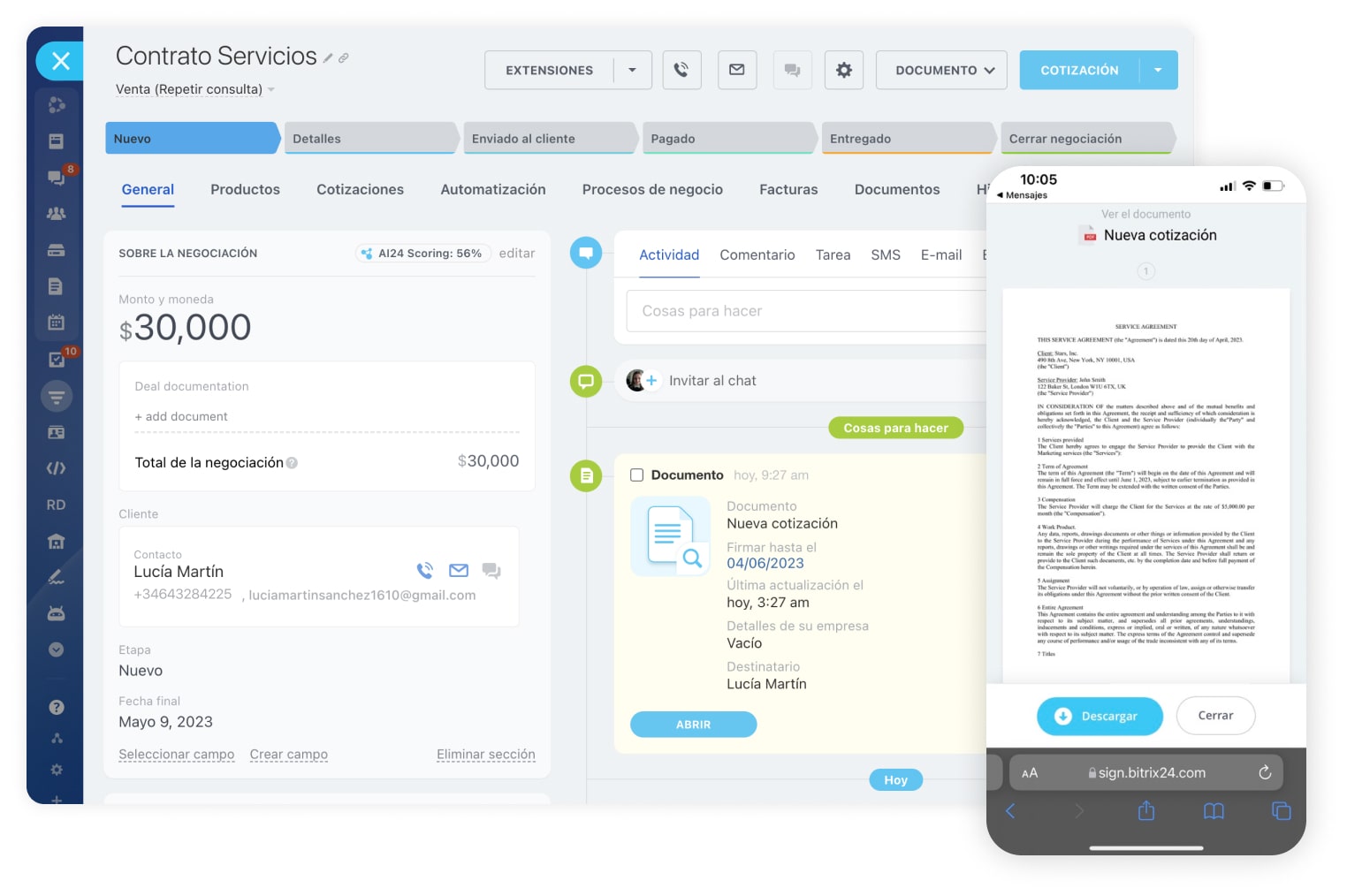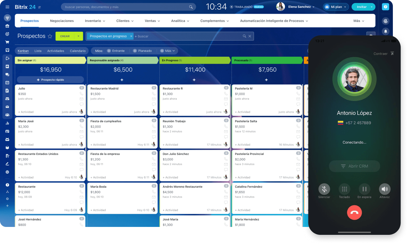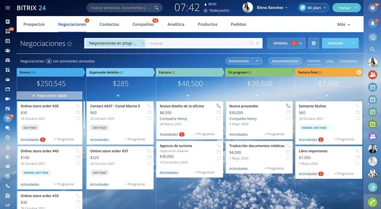 El CRM de Bitrix24 tiene todo lo que necesitas para obtener prospectos, convertirlos en negociaciones, recibir pagos, gestionar inventarios, documentos con firma electrónica, lanzar campañas de marketing, aumentar la participación y la retención del cliente, métricas para el seguimiento de ventas y más.