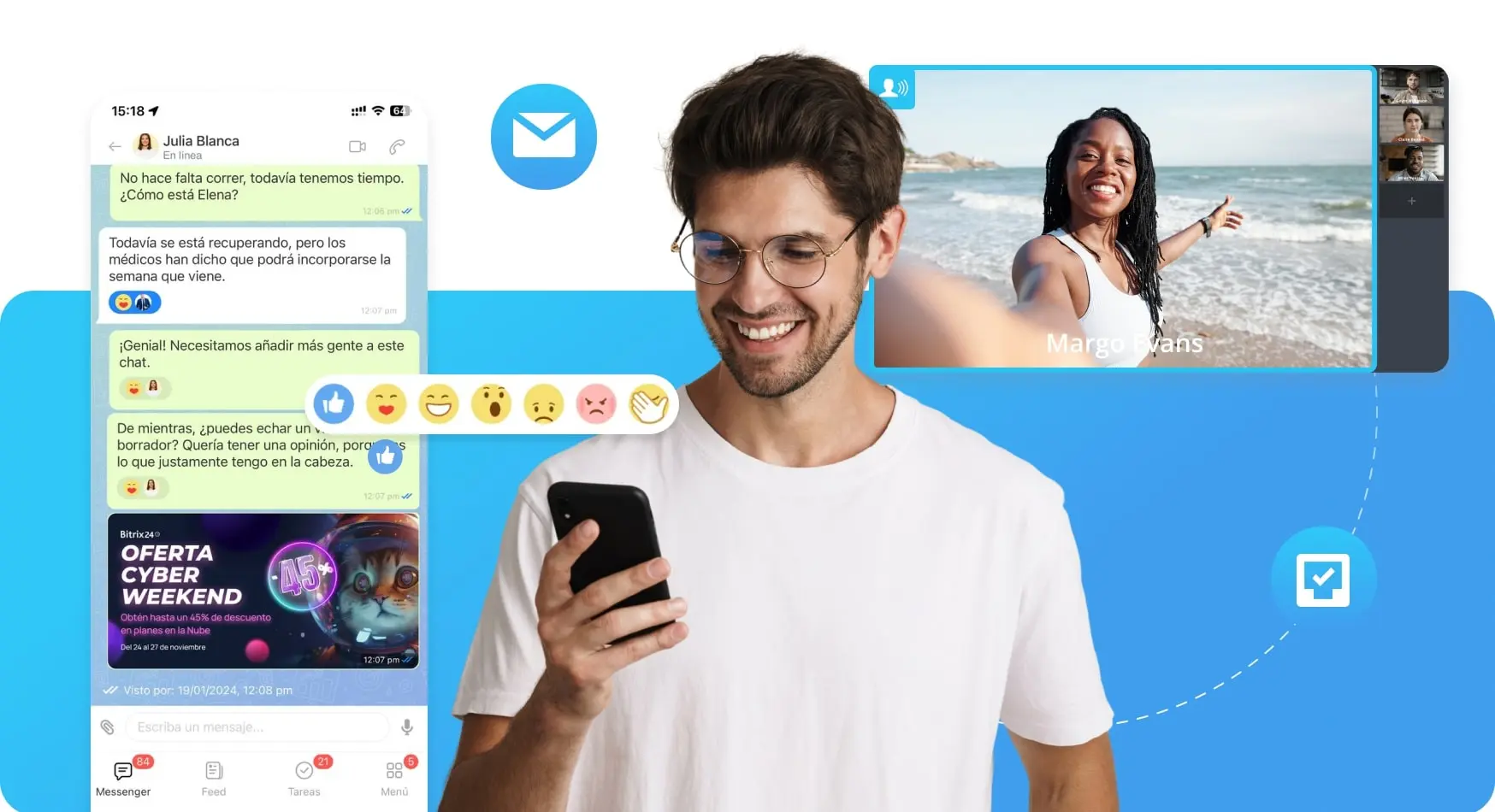 Además de las herramientas únicas para ventas y marketing, Bitrix24 cuenta con todo lo que necesita tu equipo para colaborar y comunicarse eficientemente: chat, videollamadas y conferencias, almacenamiento de archivos, calendario, documentos en línea, aplicación móvil de ventas, tareas, monitoreo del tiempo de trabajo y más.