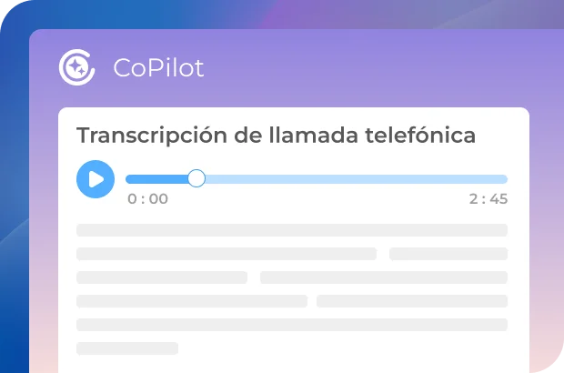 ¿Terminaste una llamada de 35 minutos con un cliente? No necesitas volver y escucharla toda, nuestro CoPilot transcribirá tu llamada en un formato de texto fácil de leer.