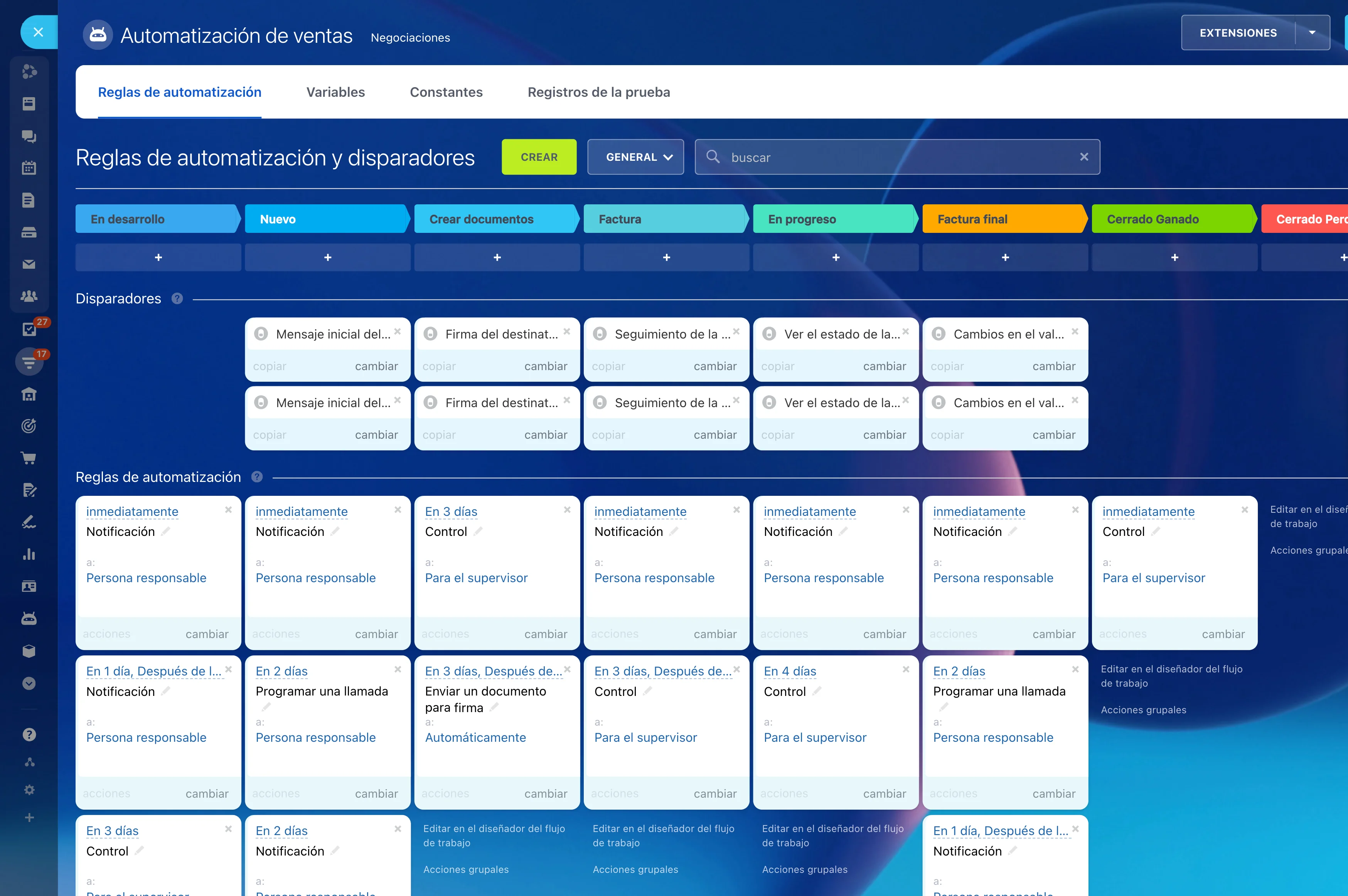 Establece una regla de automatización (p. ej.: "crear una tarea nueva") que se activará cuando un prospecto (o una negociación) cambie de estado en el canal de ventas. Las reglas de automatización pueden especificar el tiempo y la acción de activación: tarea, notificación, correo electrónico, llamada y cualquier otra acción de tu elección.