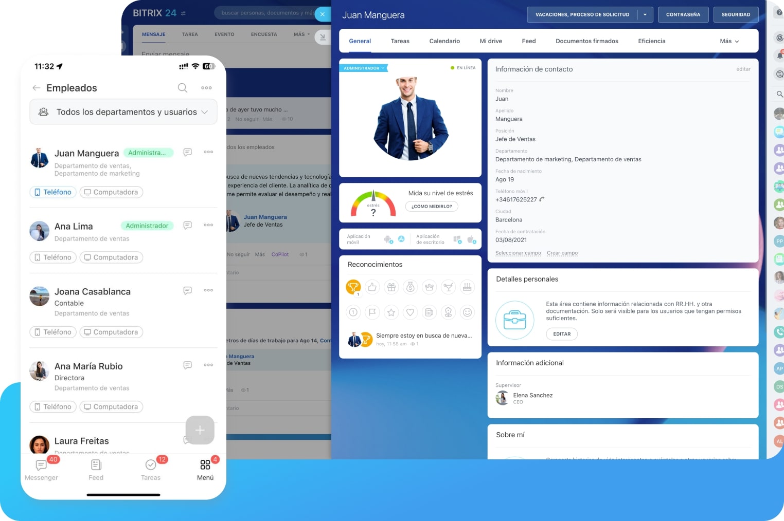 Administra tu equipo usando nuestra aplicación móvil: todos tus chats, videollamadas, tareas, reuniones, comentarios, perfiles de empleados y documentos están aquí.