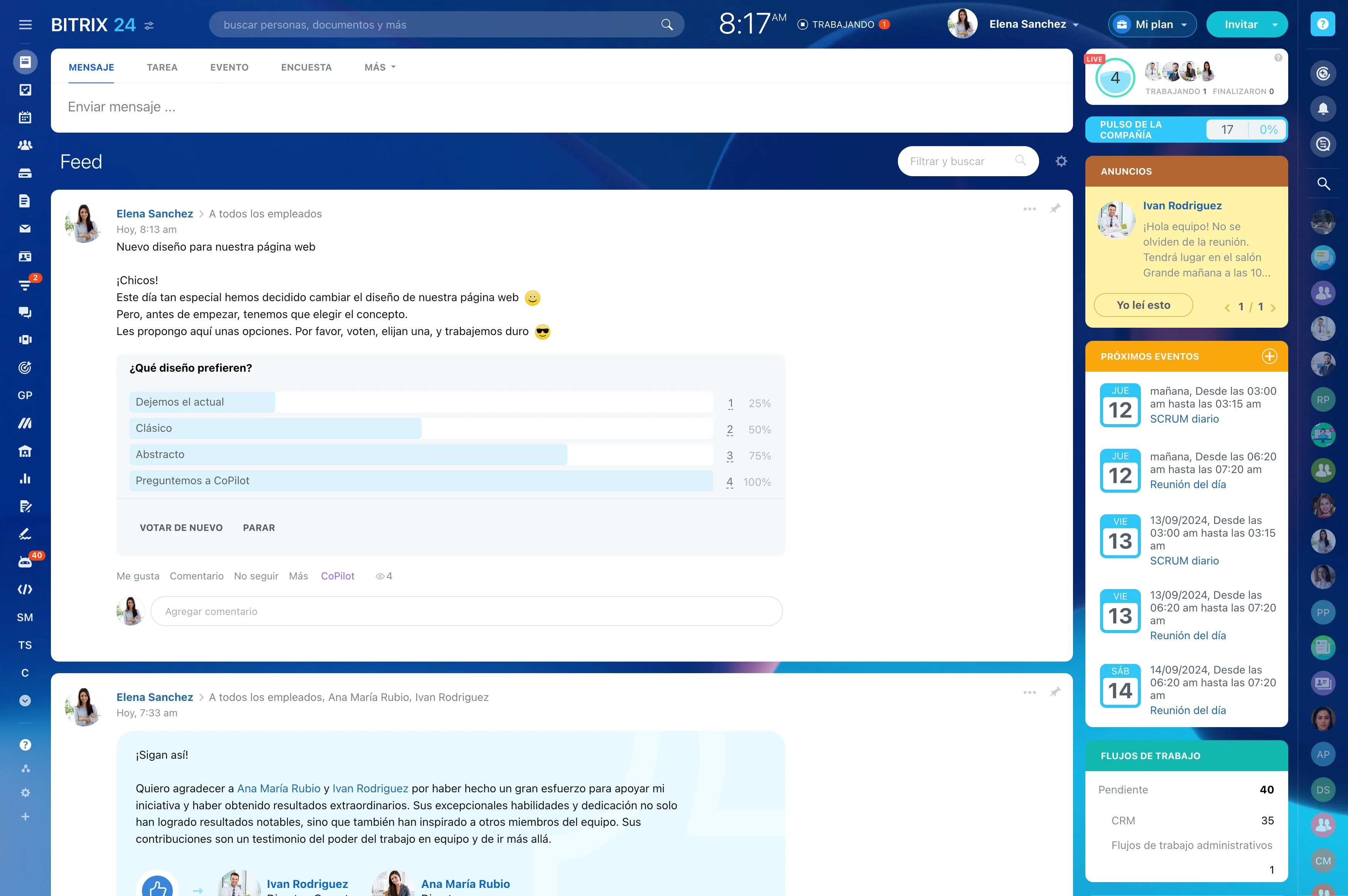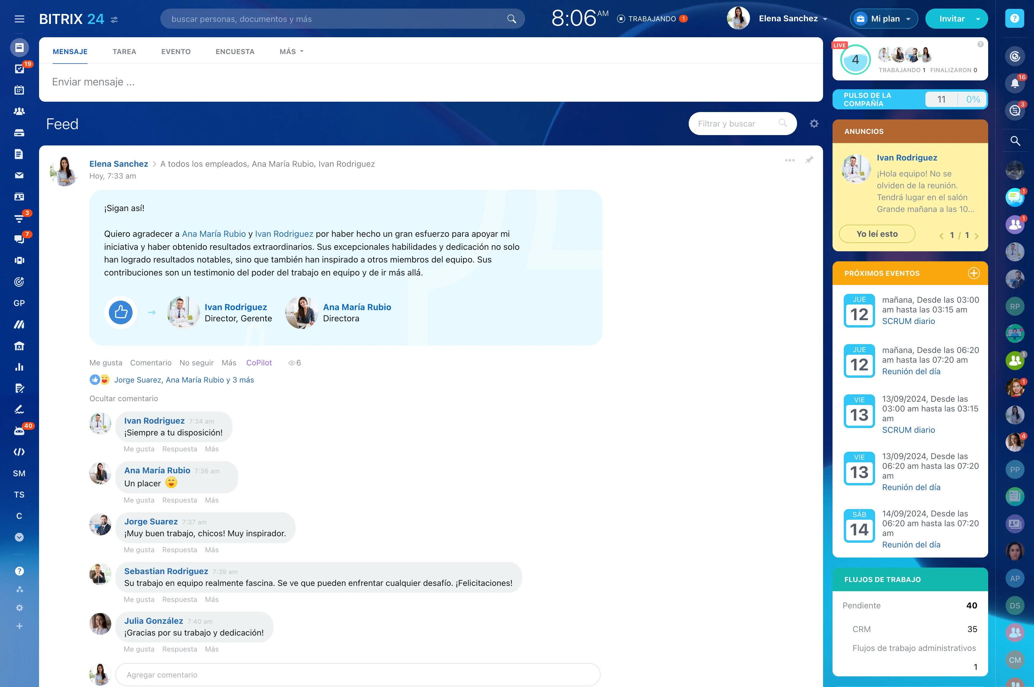 El feed en Bitrix24 es el lugar donde puedes leer las noticias de la empresa y el equipo, ver anuncios, participar en encuestas y conversar en los comentarios, o compartir una publicación propia con los miembros de equipo seleccionados o toda la empresa.