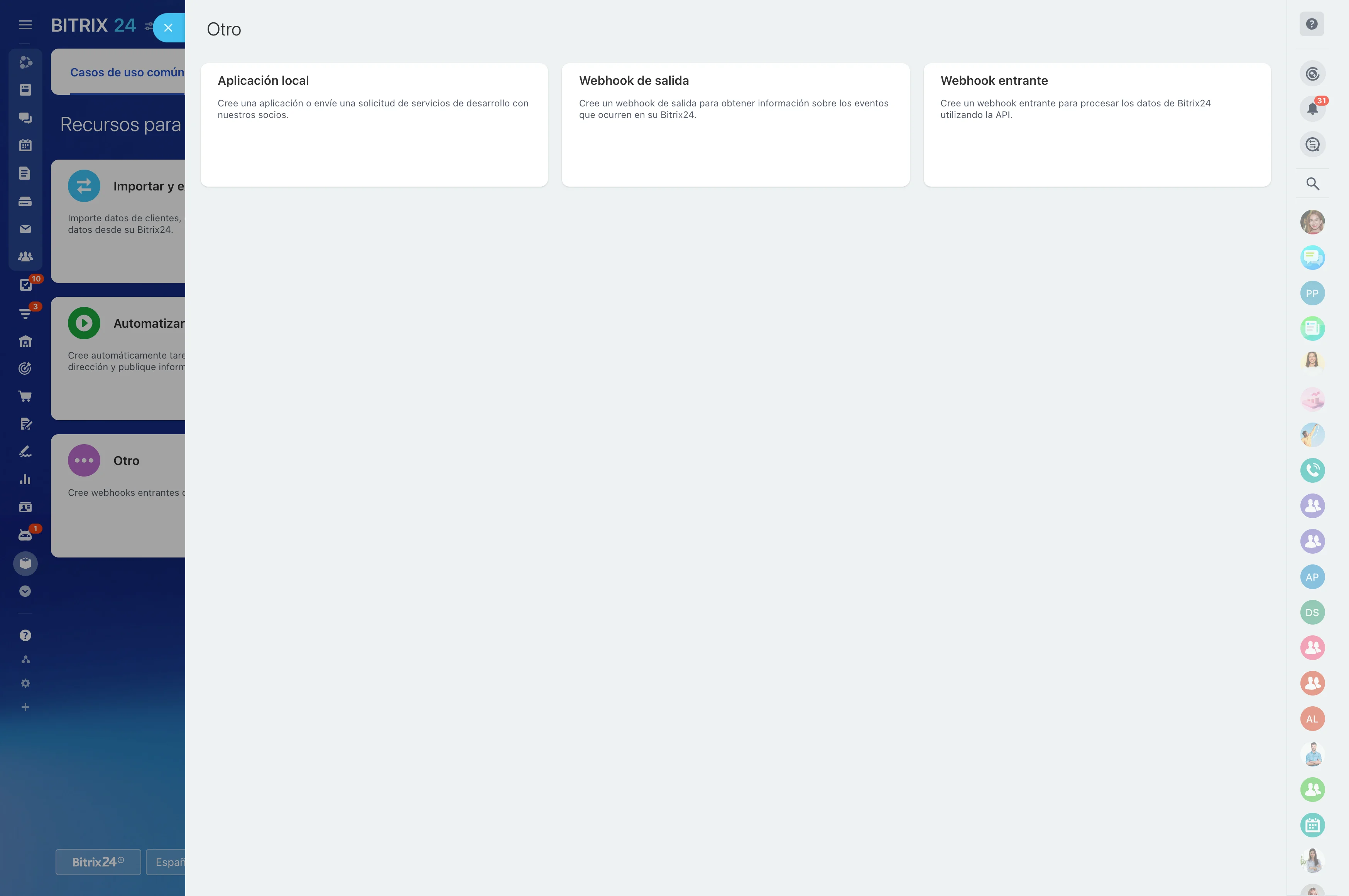 Los webhooks salientes te permiten obtener información sobre los eventos en Bitrix24. Para procesar la información de BItrix24 en la API, puedes crear un webhook entrante.