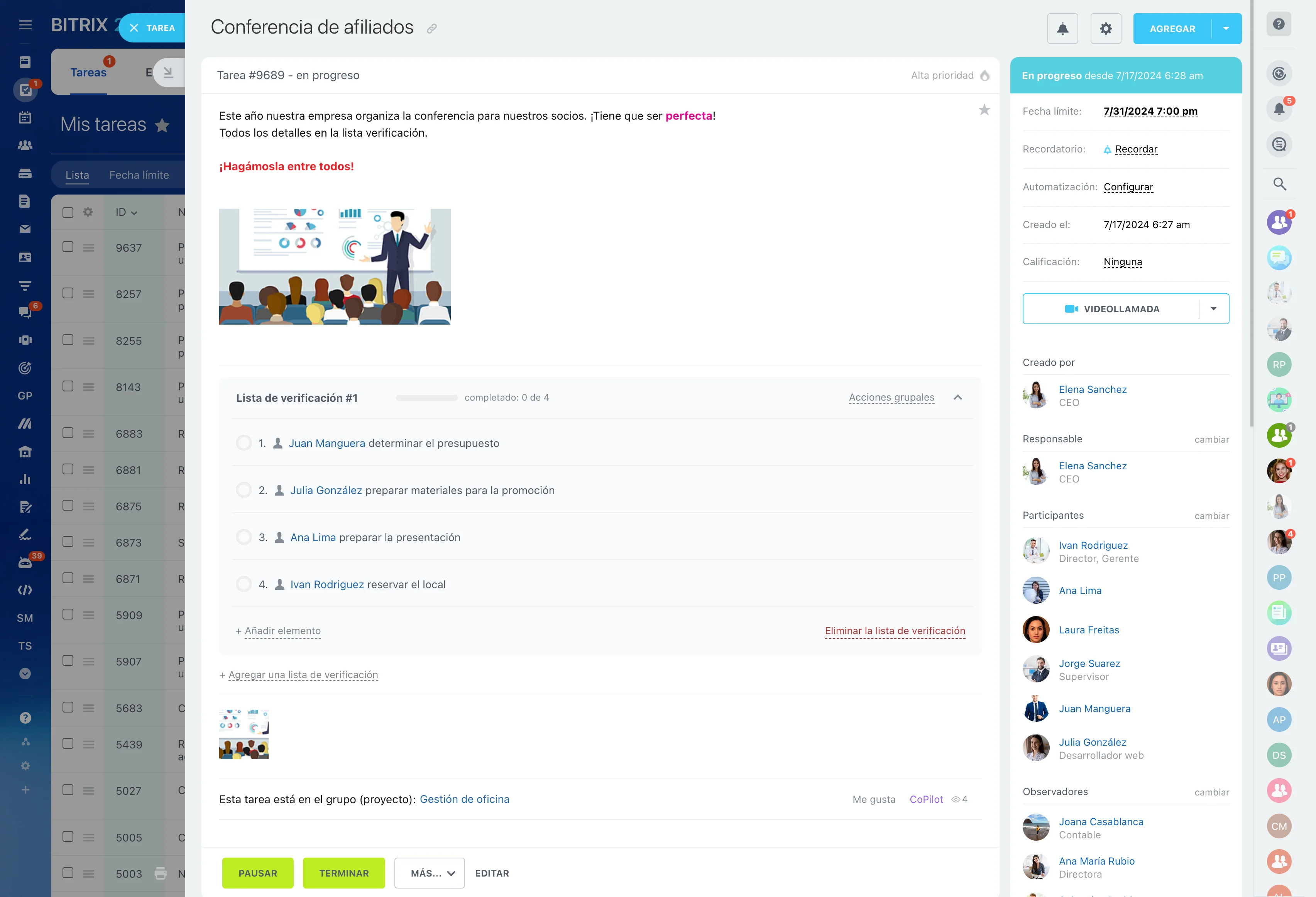 Agregar una lista de verificación a tu tarea en el seguimiento de tarea de Bitrix24 facilita completarla y asegurarse de que no pasaste por alto ningún detalle importante.