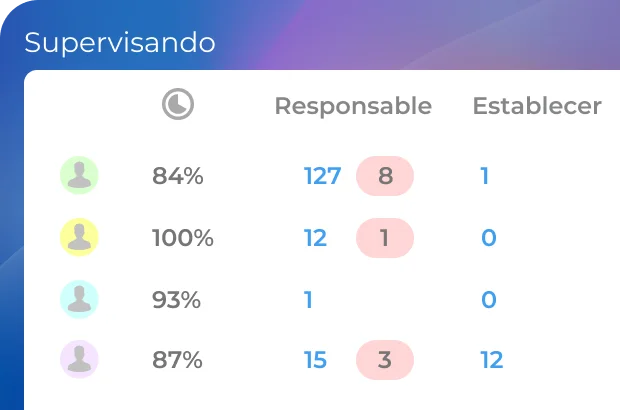 En el panel de control del supervisor puedes ver en qué trabaja cada uno de tus subordinados en el momento y cuántas tareas tienen. Desde ahí puedes ir rápidamente a cualquiera de las tareas y revisar el progreso.