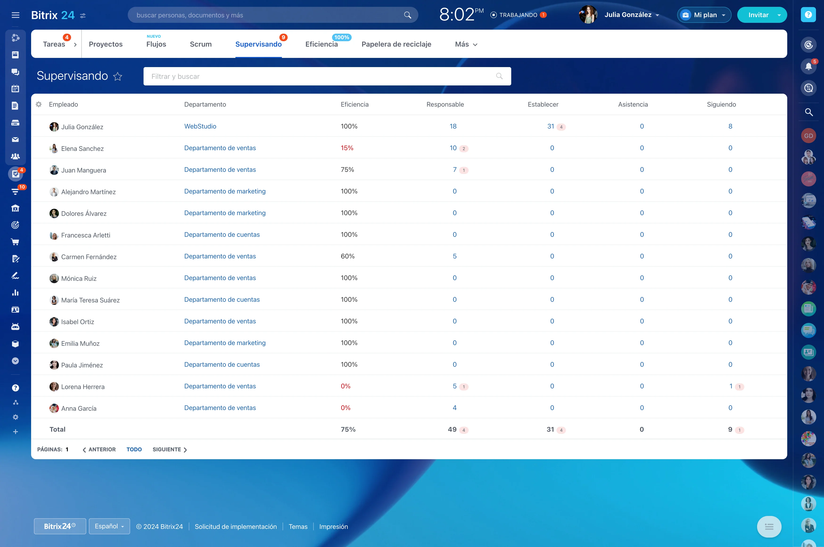 En la vista del supervisor puedes ver todas las tareas en las que tus subordinados trabajan, ayudan o siguen, así como su eficiencia. Esta es una herramienta indispensable para la planificación de las tareas y la optimización de la carga de trabajo.