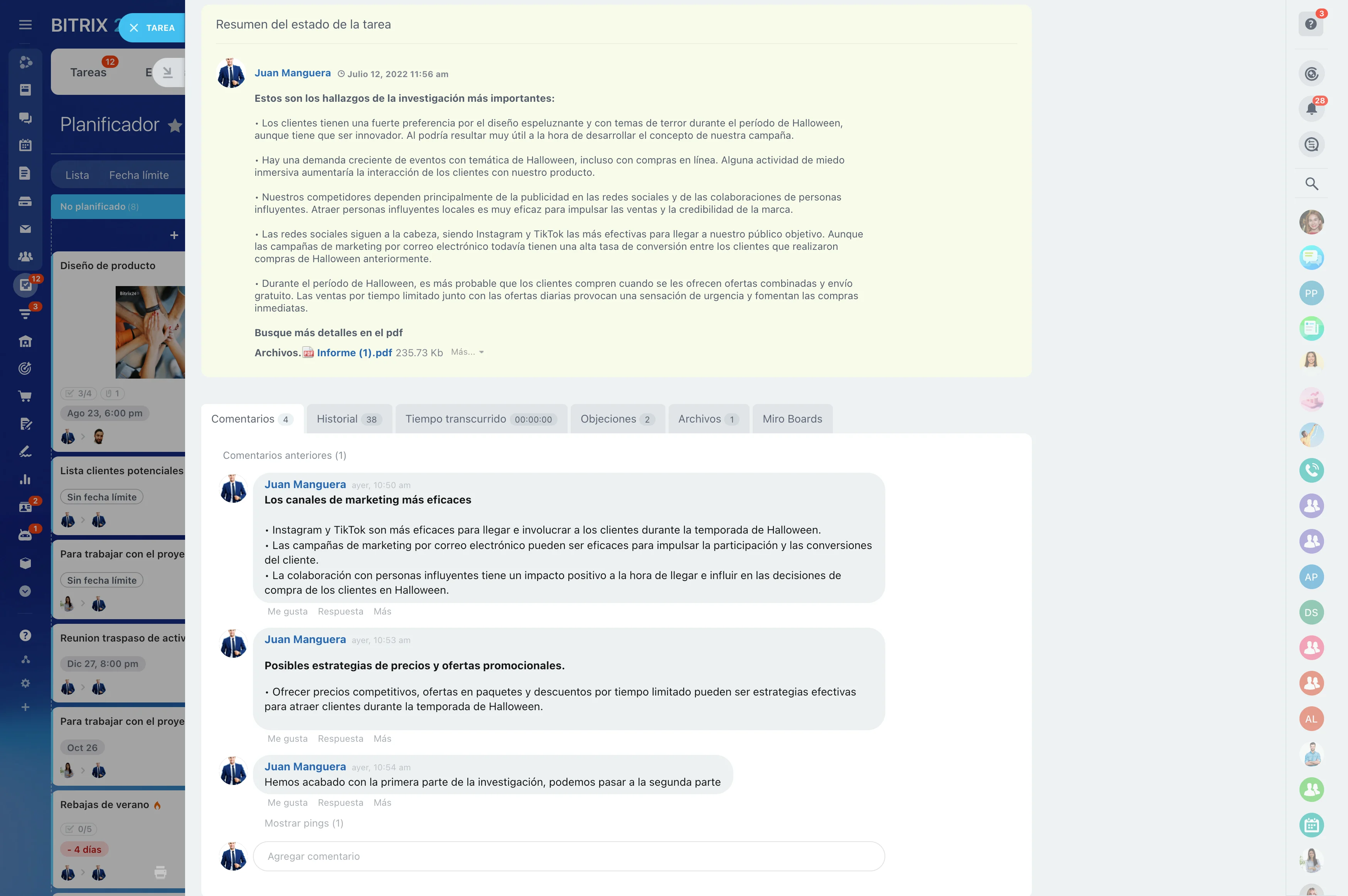 Incluso con más de 100 comentarios en una tarea, el responsable siempre puede fijar un comentario con el resultado final, marcándolo como resumen, lo que significa que se completó la tarea.